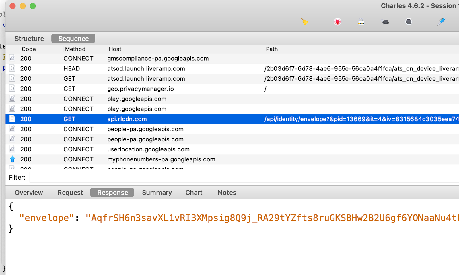 After making sure an identity envelope is retrieved, you can now check if the envelope is sent in the Google ad request. To do this, load an ad placement that is enabled for open bidding and capture the outgoing GMA SDK ad request (you may need to enable network tracing).